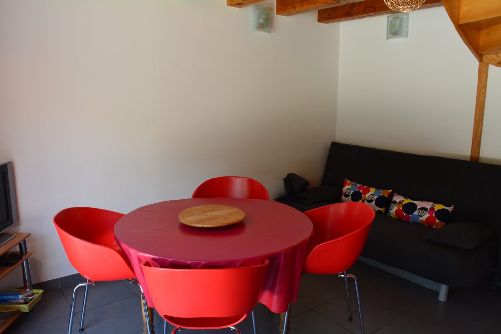 Salon avec clic-clac (140×190), 1 table et 4 chaises, 1 TV écran plat, 1 lecteur DVD, 1 clim réversible.